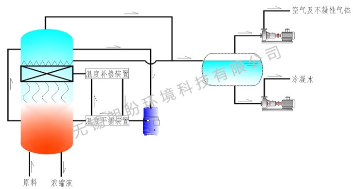 低溫蒸發(fā)的原理是物料的沸點隨著壓強的降低而降低。低溫真空蒸發(fā)器由真空泵抽成真空狀態(tài),蒸發(fā)室的真空度約為95%~97%,在此壓強下水的沸點為35℃~37℃,系統(tǒng)無需配備進(jìn)料泵,利用蒸發(fā)室的負(fù)壓將物料吸進(jìn)蒸發(fā)室,通過強制循環(huán)泵將物料循環(huán)霧化,噴淋至換熱器上,物料中水分被蒸發(fā),物料連續(xù)循環(huán)霧化,通過蒸發(fā)室液位自動補料,濃度達(dá)到要求后作為濃縮液排出設(shè)備。濃縮液一般粘度較大,需采用泵抽出。