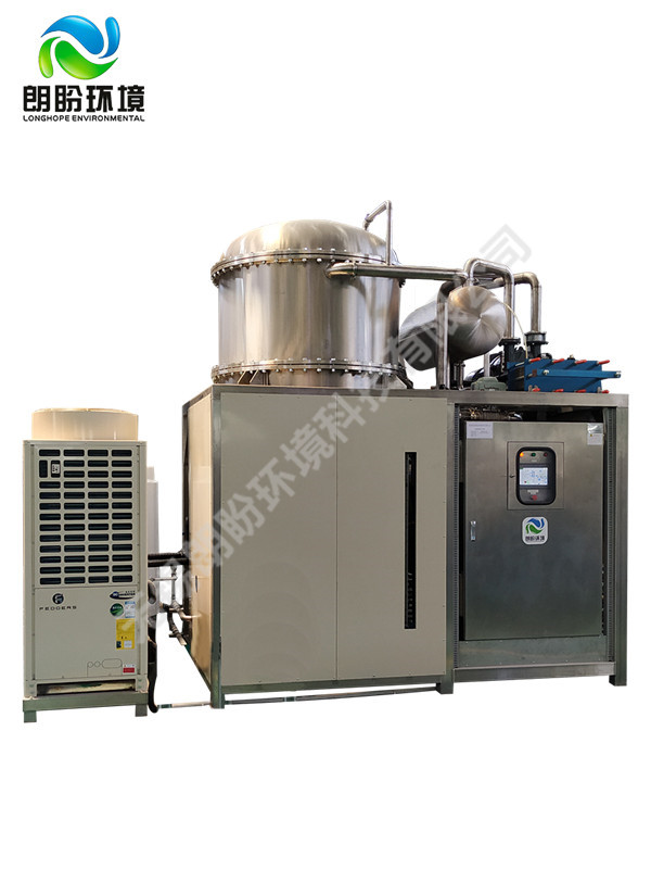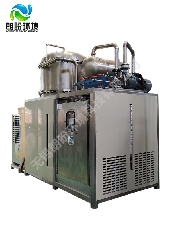 低溫蒸發(fā)結(jié)晶器的原理是物料的沸點隨著壓強的降低而降低。低溫節(jié)能濃縮設(shè)備整體保持真空狀態(tài),蒸發(fā)室的真空度約為95%~97%,在此壓強下水的沸點為35℃~37℃,系統(tǒng)無需配備進料泵,利用蒸發(fā)室的負(fù)壓將物料吸進蒸發(fā)室,通過強制循環(huán)方式將物料循環(huán)霧化,傳輸至換熱器上,物料中水分被蒸發(fā),物料連續(xù)循環(huán)霧化,通過蒸發(fā)室液位自動補料,濃度達(dá)到要求后作為濃縮液排出設(shè)備。濃縮液一般粘度較大,需采用泵抽出。